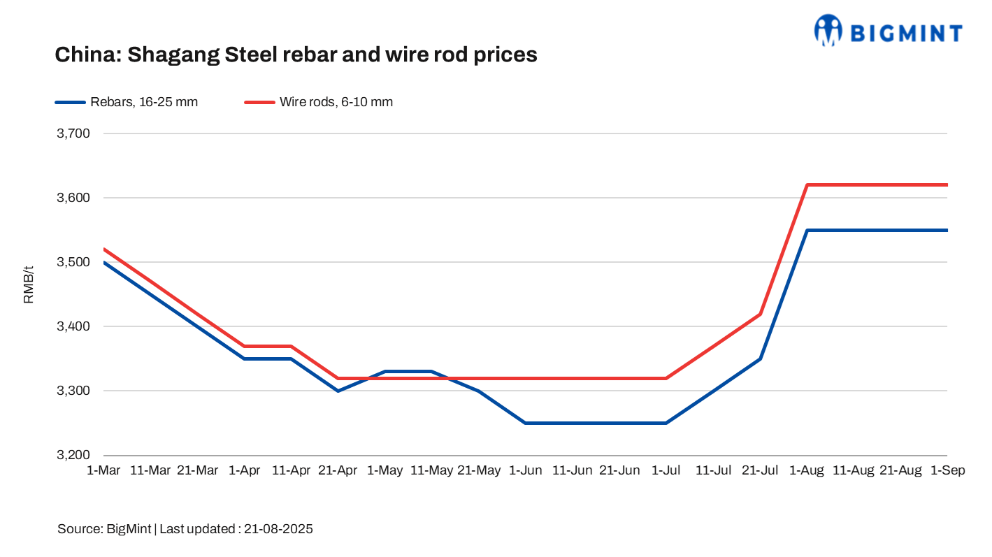 China’s Shagang Steel has kept its rebar and wire rod prices unchanged for early-Sep’25 sales, as per sources. Prices of rebars, coiled rebars, and wire rods were as follows:
