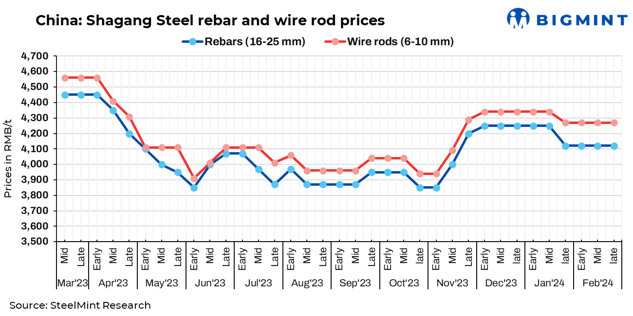 Shagang Group (Shagang), China’s leading privately-owned steelmaker headquartered in East China’s Jiangsu province, is rolling over its list prices for rebar, wire rod and bar-in-coil for sales over February 21-29, the company announced on Wednesday.