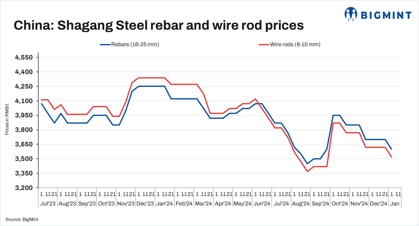 • Rebar (16-25 mm): RMB 3,600/t ($493/t)