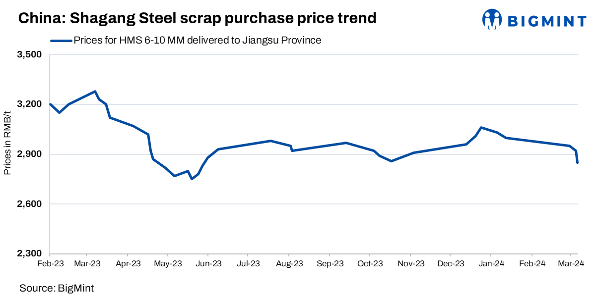 Shagang Steel, a leading steel mill in China, has lowered purchase prices for ferrous scrap across all grades by RMB 70/t ($10/t) effective from 12 Mar’24. The revised price for HMS (6-10 mm) now stands at RMB 2,850/t ($396/t), including 13% VAT. This marks the third consecutive price reduction this month, influenced by the recent decline in Japanese Kanto scrap export tender prices.