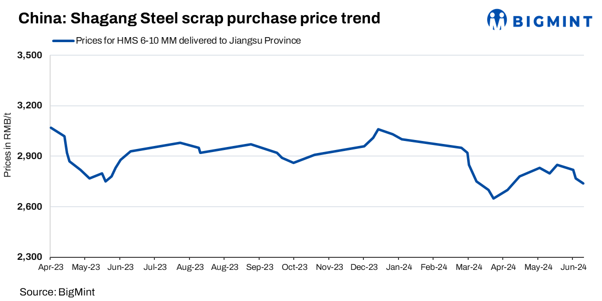 Shagang Steel has announced a further reduction in purchase prices for ferrous scrap, effective 12 Jun’24. The updated prices reflect a decrease of RMB 30/t ($4/t). Under the new pricing structure, HMS (6-10 mm) is now priced at RMB 2,740/t ($378/t), including 13% VAT. Notably, this marks the company’s third price cut in June, bringing the total decline to RMB 110/t ($15/t).