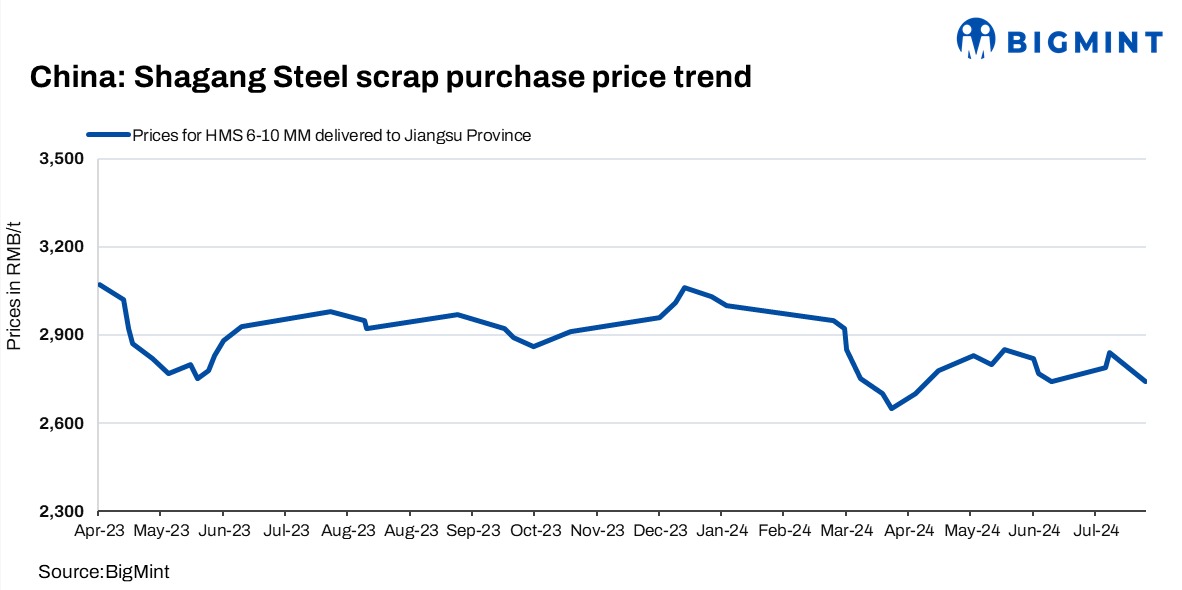 Shagang Steel has further reduced its ferrous scrap procurement prices by RMB 50/t ($7/t) for all grades effective 24 Jul’24. Under the new pricing structure HMS (6-10 mm) is now priced at RMB 2,690-2,740/t ($370-378/t), including 13% VAT. Notably, this marks the company’s second price cut in July, bringing the total decline to RMB 100/t ($14/t).
