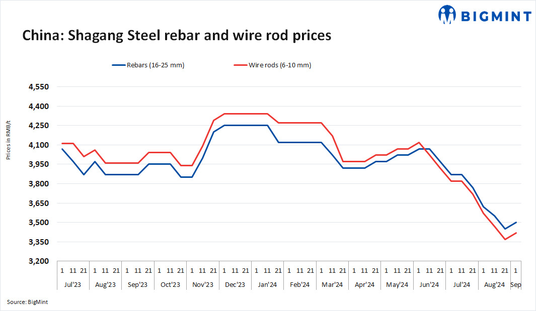 China’s Shagang Steel has increased prices for rebar, wire rod, and coiled rebar by RMB 50/t ($7/t) for its early Sep’24 sales. Effective prices are as follows: