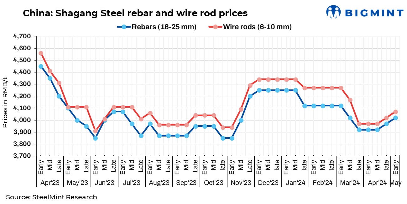 China’s Shagang Steel has hiked long steel prices by RMB 50/t ($7/t) w-o-w for early-May’24 sales. Notably, the company had previously increased long steel prices for late-Apr’24 sales as well. Effective prices: