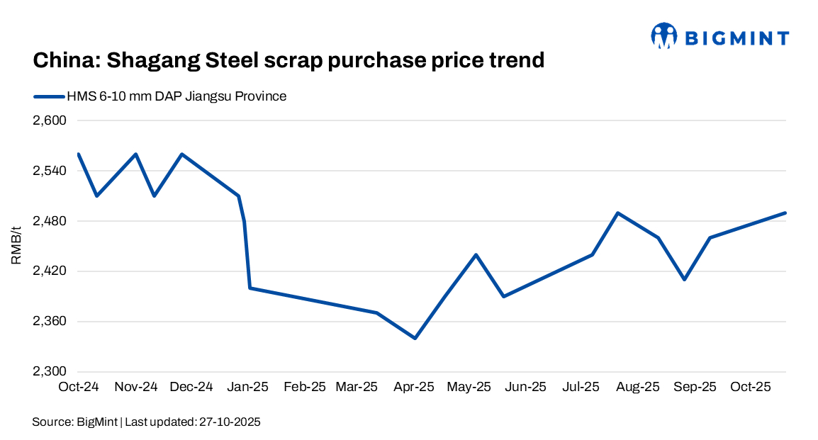 - China’s leading steel mill, Shagang Steel, increased its scrap procurement prices by RMB 30/t ($4/t) on 27 Oct’25.