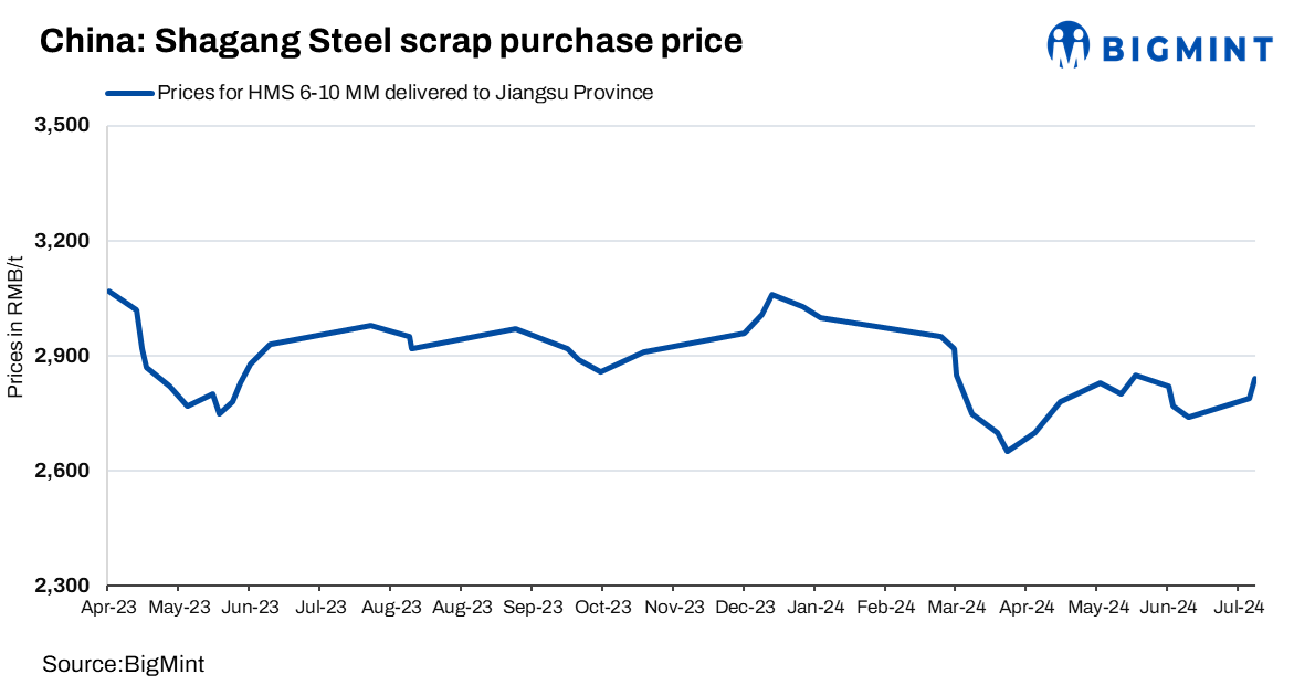 Shagang Steel has declared an additional increase of around RMB 50/t ($7/t) in ferrous scrap procurement prices with effect from today. The new price of HMS (6-10 mm) is now RMB 2,840/t ($391), including 13% VAT. Remarkably, this is the second increase in this month.