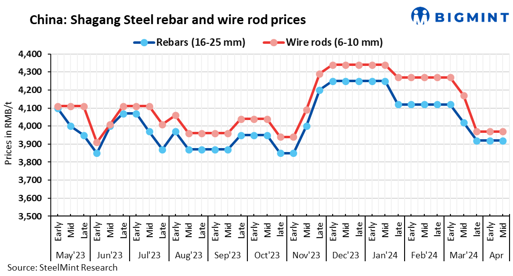 China’s Shagang Steel has continued to keep long steel prices stable for mid-Apr’24 sales. Effective prices: