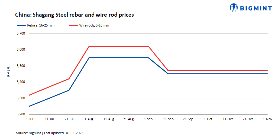 China’s Shagang Steel rolled over long steel prices for early-Nov’25 sales. Prices of rebars, coiled rebars and wire rods are as follows: