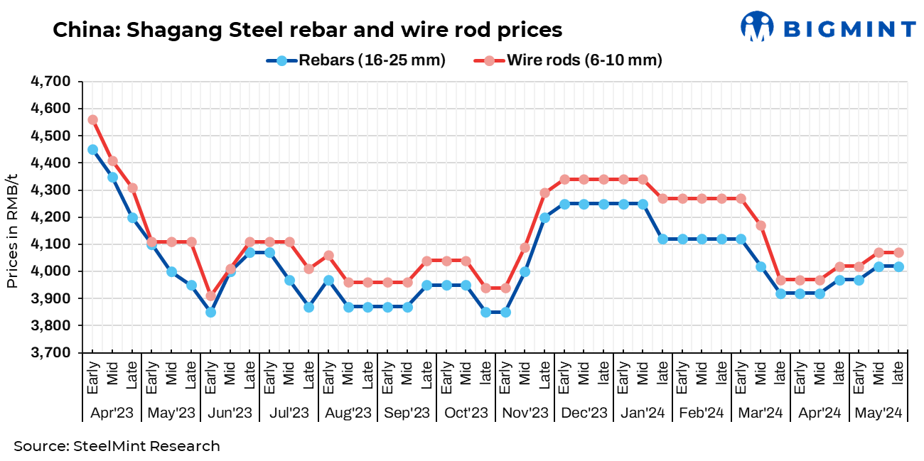 China’s Shagang Steel has kept long steel prices stable for late-May’24 sales. Effective prices: