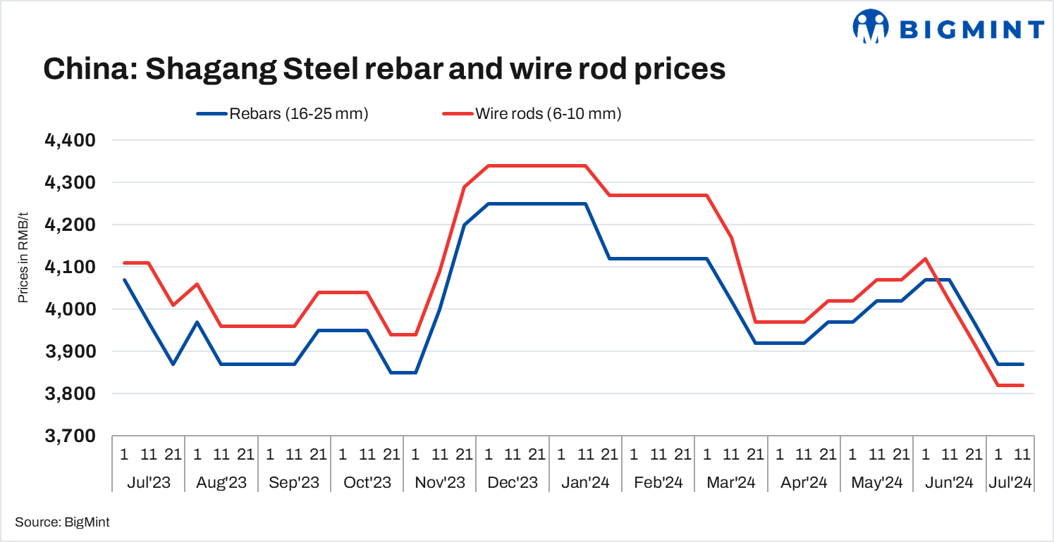 China’s Shagang Steel has kept long steel prices stable for mid-July’24 sales. Effective prices: