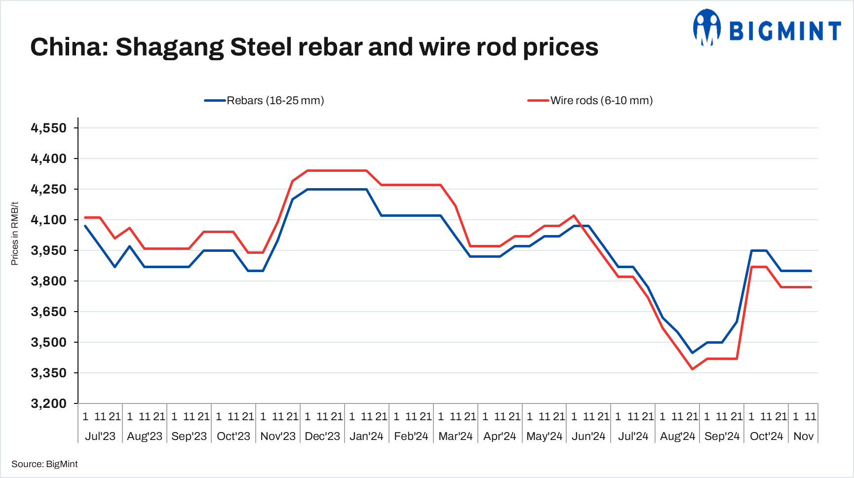 China’s Shagang Steel has kept its long steel products’ prices unchanged for mid-Nov’24 sales. Prices of rebars, coiled rebars, and wire rods were stable w-o-w. Effective prices stood at: