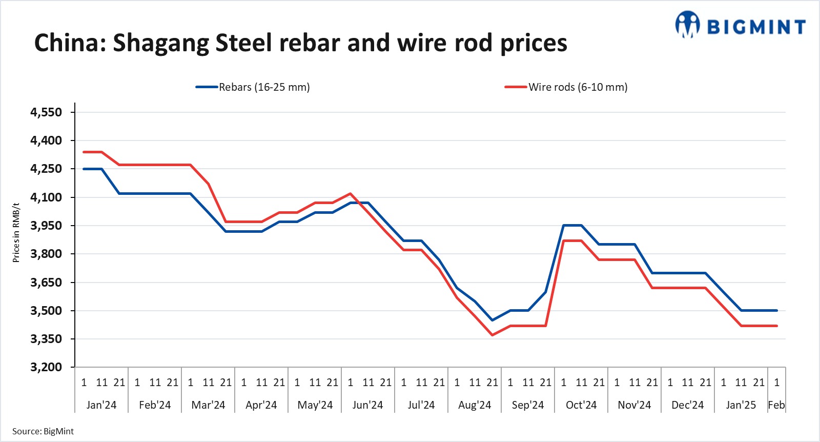 China’s Shagang Steel has kept prices of its long steel products – rebars, coiled rebars, and wire rods – unchanged for early-Feb’25 sales. Effective prices now stand at: