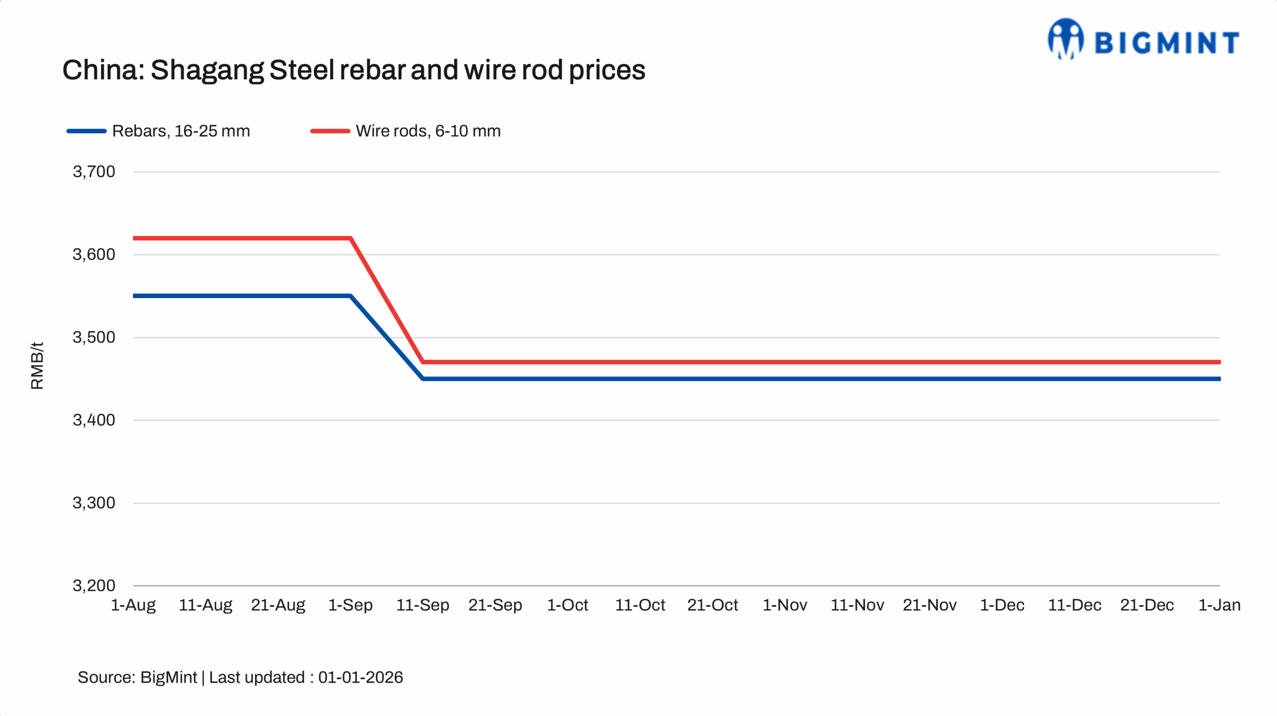China’s Shagang Steel has kept its long steel prices unchanged for early-Jan’26 sales, with no price revisions announced since 11 Sept’25. Prices of rebars, coiled rebars, and wire rods are as follows: