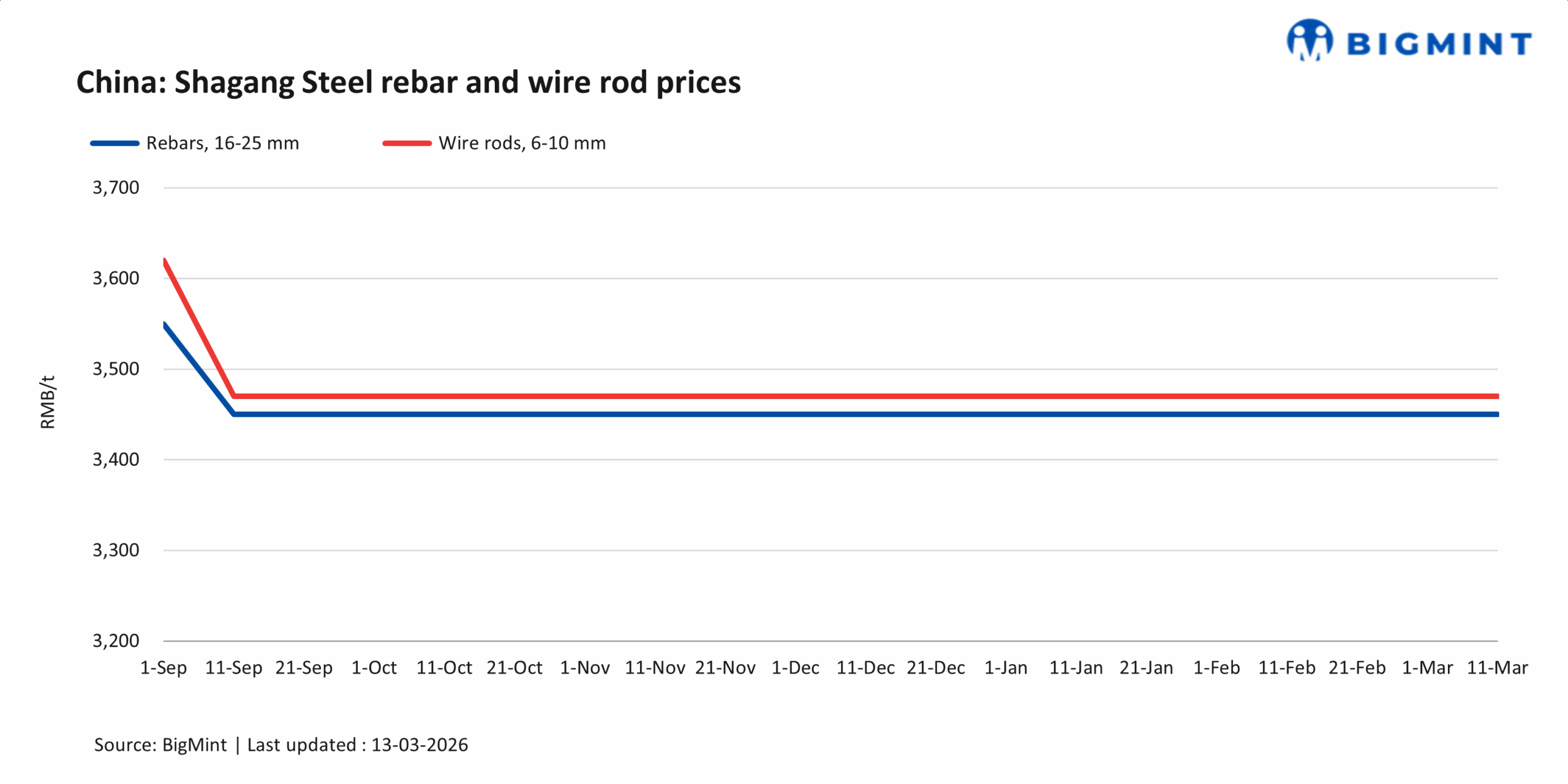 Shagang Steel in China has continued to keep its long steel prices unchanged for mid-Mar’26 sales, with no price revisions announced since 11 Sep’25. Prices of rebars, coiled rebars, and wire rods are as follows: