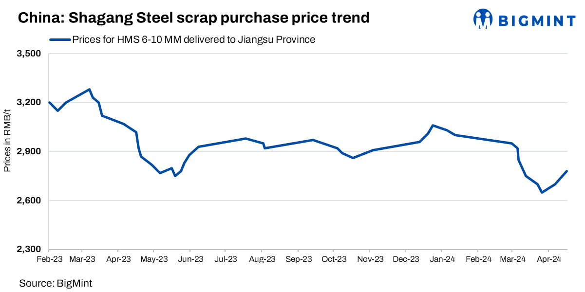 Shagang Steel has recently announced an upward adjustment in the purchasing rates for ferrous scrap across grades, with effect from 22 Apr’24. The updated rates show an increase of RMB 80/t ($11/t). The revised prices of HMS (6-10 mm) stand at RMB 2,780/t ($384/t), including 13% VAT. This marks the second purchase price hike of CY’24 after consecutive price cuts since Jan.