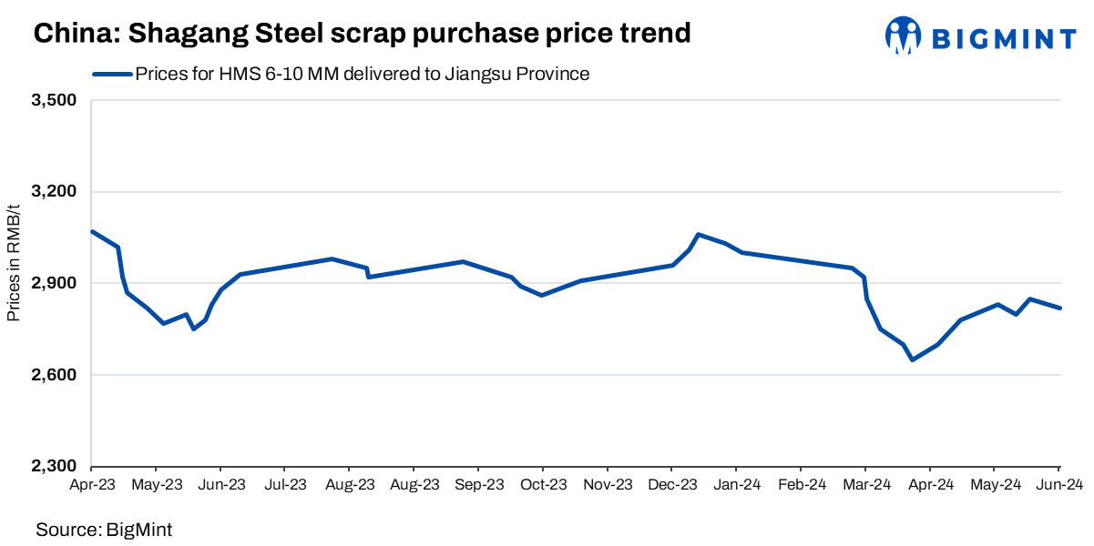 Shagang Steel recently announced a reduction in purchase prices of ferrous scrap across grades, effective 4 June 2024. The updated prices reflect a drop of RMB 30/t ($4/t). Under the revised pricing structure, HMS (6-10 mm) now stands at RMB 2,830/t ($389/t), including 13% VAT.