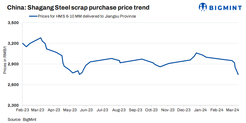 Shagang Steel has announced a reduction in purchase prices for ferrous scrap across all grades, effective from 18 Mar’24. The new prices have been decreased by RMB 50/t ($7/t). Consequently, the revised price for HMS (6-10 mm) now amounts to RMB 2,750/t ($382/t), inclusive of 13% VAT. This marks the fifth consecutive price reduction within this month. It’s worth mentioning that the company had also lowered scrap procurement prices by RMB 50/t ($7/t) on 15 Mar’24.