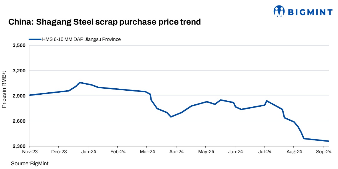 China’s Shagang Steel has reduced its ferrous scrap procurement prices by RMB 30/t ($4/t) for all grades, effective 9 Sep’24. Revised HMS (6-10 mm) prices stood at RMB 2,360/t ($332/t), including 13% VAT. This represents the company’s first price cut in Sep’24, following an adjustment on 16 Aug’24. Chinese domestic scrap prices have been under pressure due to limited buying and falling rebar prices amid increased supply.
