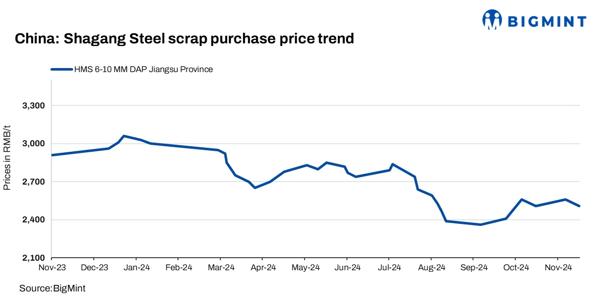 Shagang Steel, China’s largest steel producer, has reduced ferrous scrap procurement prices by RMB 50/t ($7/t) across grades, effective 18 Nov’24. Post-revision, HMS (6-10 mm) stood at RMB 2,510/t ($346/t), including 13% VAT.