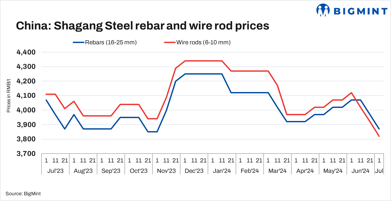 China’s Shagang Steel has reduced long steel prices by RMB 100/t ($14/t) for early-July’24 sales. Effective prices: