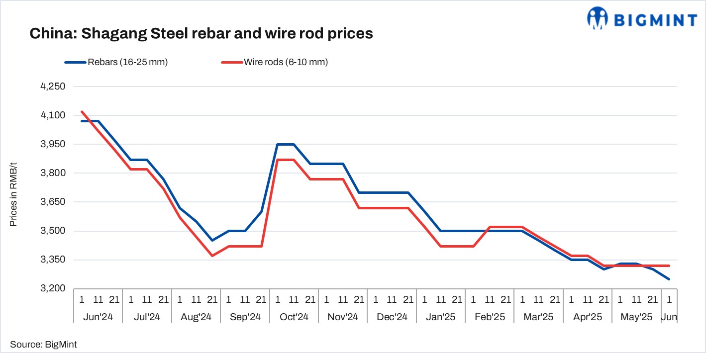 China’s Shagang Steel reduced rebar prices by $7/t for early-Jun’25 sales. Prices of coiled rebars and wire rods remained stable. Post revision, prices of rebars, coiled rebars, and wire rods are as follows: