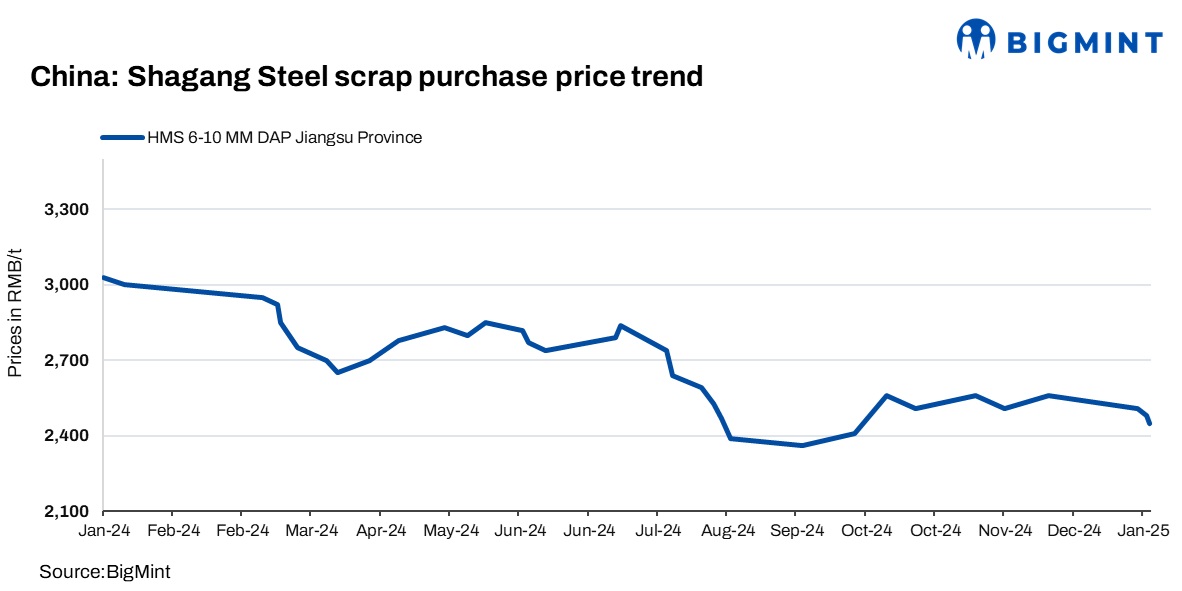 China’s leading steel mill, Shagang Steel, reduced scrap procurement prices by RMB 30/t ($4/t) for all grades from 7 Jan’25, with HMS (6-10 mm) now at RMB 2,450/t ($334/t), including 13% VAT. Notably, this marks the company’s third consecutive price cut in Jan. As the Chinese New Year (28 Jan-4 Feb) approaches, domestic steelmakers are slowly reducing production.