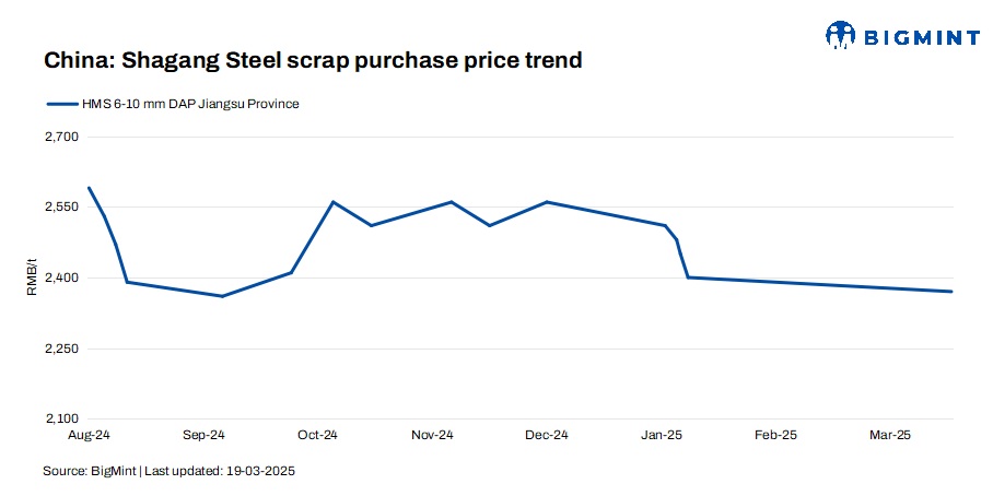 China’s leading steel mill, Shagang Steel, reduced scrap procurement prices by RMB 30/t ($4/t) across all grades from 19 Mar’25. As a result, HMS (6-10 mm) is now priced at RMB 2,370/t ($328/t), including 13% VAT. This marks the first price cut by the company in Mar’25 after keeping prices stagnant since 9 Jan’25. Overall, steel scrap prices in China have dropped by RMB 140/t ($20/t) from Jan’25.