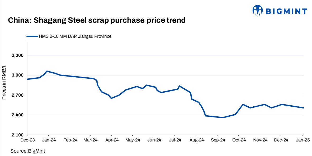 China’s leading steel mill, Shagang Steel, has reduced scrap procurement prices by RMB 50/t ($7/t) across all grades from 3 Jan’25, with HMS (6-10 mm) now at RMB 2,510/t ($344/t), including 13% VAT. Rising scrap inventories, which reached 6.2 mnt due to winter stocking, coupled with lukewarm steel demand, pressured prices. Notably, this marks the company’s first price cut in January.