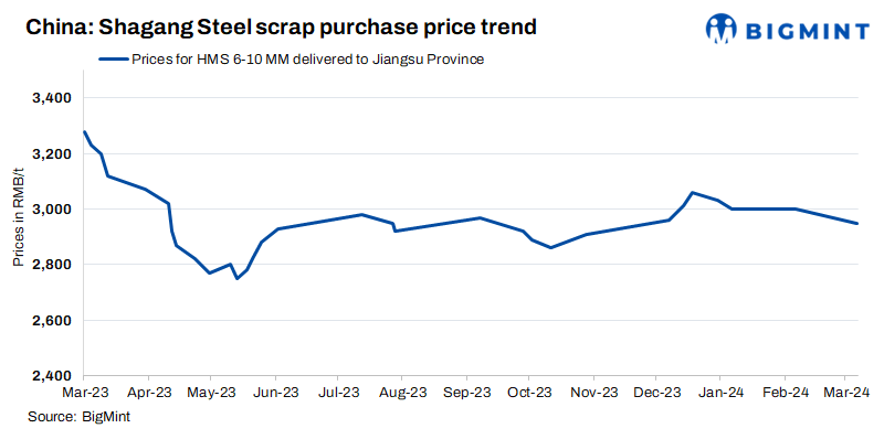 Shagang Steel, a prominent steel mill in China, has reportedly decreased procurement prices for ferrous scrap across all grades by RMB 50/t ($7/t), effective from 6 Mar’24. The revised price stands at RMB 2,950/t ($410/t) for HMS (6-10 mm), inclusive of 13% VAT. Notably, the company also decided to keep its long steel prices unchanged for early March 2024.