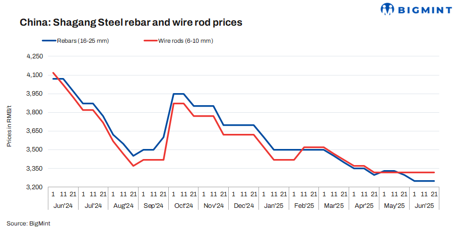 China’s Shagang Steel rolled over long steel prices for late-Jun’25 sales. Prices of rebars, coiled rebars, and wire rods are as follows:
