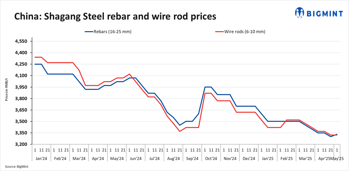 China’s Shagang Steel has rolled over long steel product prices for early-May’25 sales. Revised prices of rebars, coiled rebars, and wire rods are as follows: