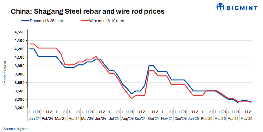 China’s Shagang Steel rolled over long steel product prices for late-May’25 sales. Prices of rebars, coiled rebars, and wire rods were as follows: