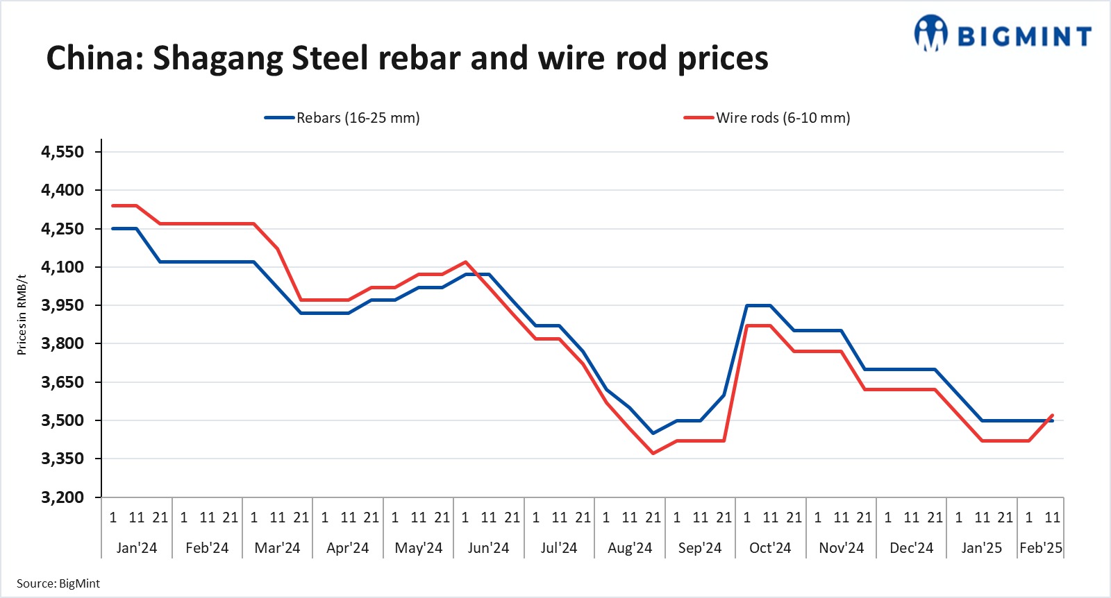 China’s Shagang Steel kept prices of its rebars unchanged for mid-Feb’25 sales. However, prices of coiled rebars and wire rods increased by RMB 100/t ($14/t). Post-revision, prices stood at: