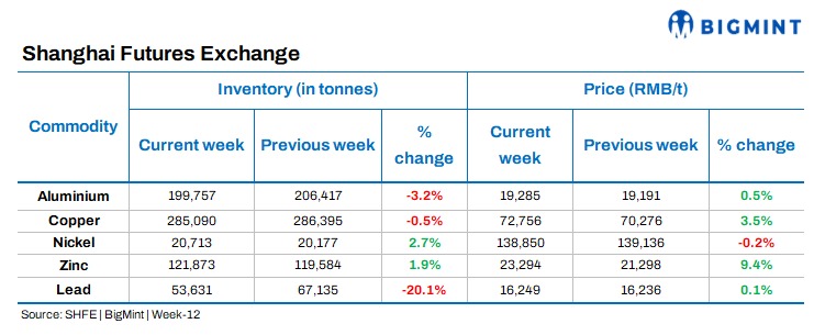 China: SHFE base metal stocks witness varied trends w-o-w, lead drops over 20%