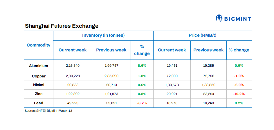 In the week ending Friday, 29 March, inventories of most deliverable base metals in Shanghai Futures Exchange (SHFE)-registered warehouses increased, with aluminum showing the highest percentage gain, while lead experienced the largest outflow.