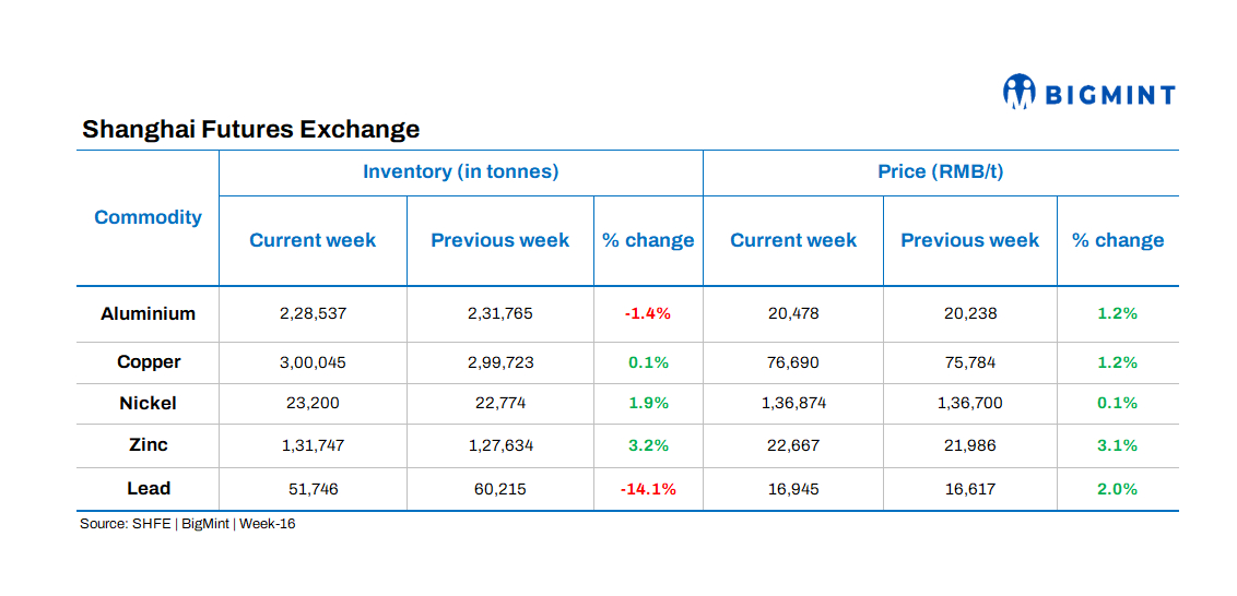 In the week ending 19 April, deliverable stocks of base metals in Shanghai Futures Exchange (SHFE)-registered warehouses experienced slight increases, except for lead and aluminum, which saw a notable decline of 14%, as per the exchange’s weekly stocks report.