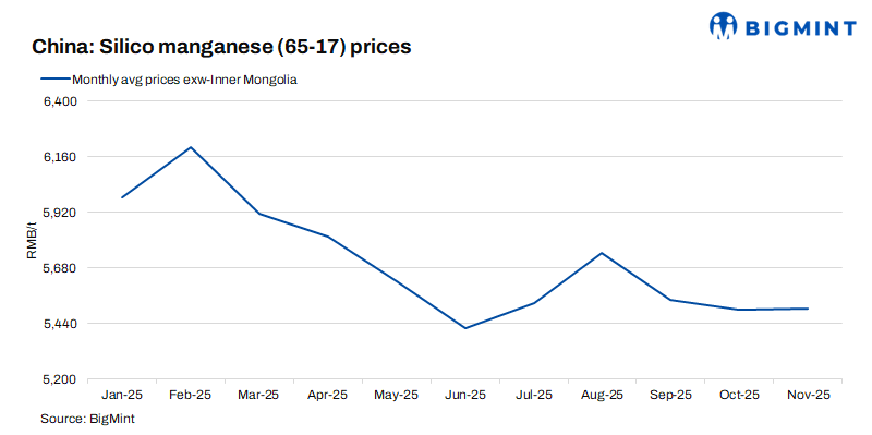 Downstream buyers mainly focused on cautious procurement, though some restocking emerged due to low inventories, causing a slight m-o-m rise in tender prices. Construction steel demand remained subdued amid real estate weakness, while stainless steel demand offered marginal support. Trading activity was dominated by long-term contracts, and spot liquidity stayed weak as traders adopted a wait-and-watch approach. Continued crude steel production limits may further dampen potential alloy demand.
