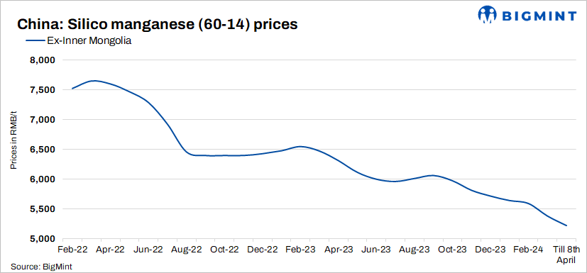 ZCE prices remain stable: Silico manganese futures for last week’s deliveries on China’s Zhengzhou Commodity Exchange (ZCE) were also consistent w-o-w at RMB 6,160/t ($844/t) on 8 April, 2024 which could also be the reason for the domestic market price consistency.