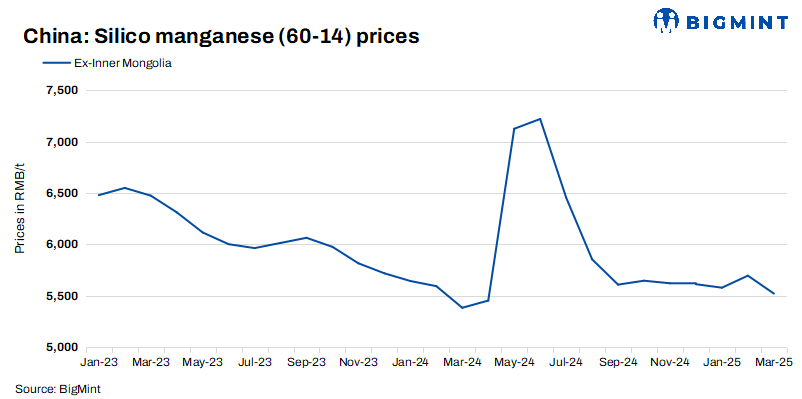 ZCE futures inch down: Silico manganese futures on China’s Zhengzhou Commodity Exchange (ZCE) for May 2025 deliveries declined by RMB 52/t ($7/t) to RMB 6,070/t ($836/t) on 31 March against RMB 6,122/t ($844/t) on 24 March.