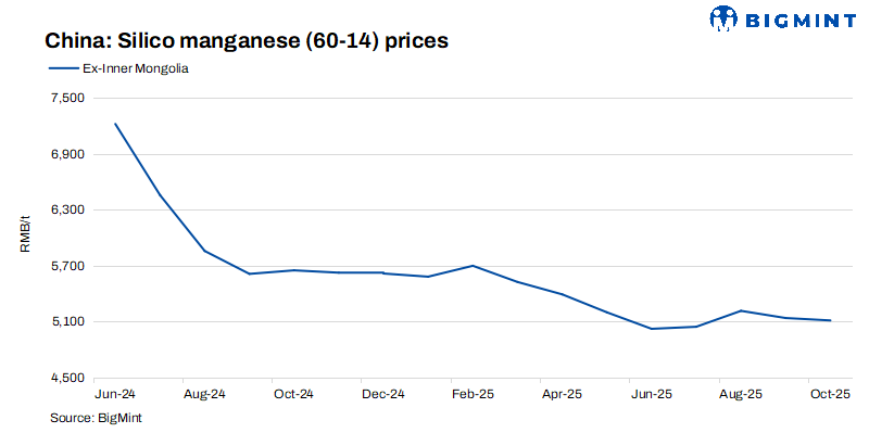 Silico manganese prices experienced a slight uptick, supported by firm ore costs, steady steel mill operations, and a rebound in crude steel production. Although exports dipped m-o-m in September, overall January-September levels remained firm, reflecting continued demand stability.