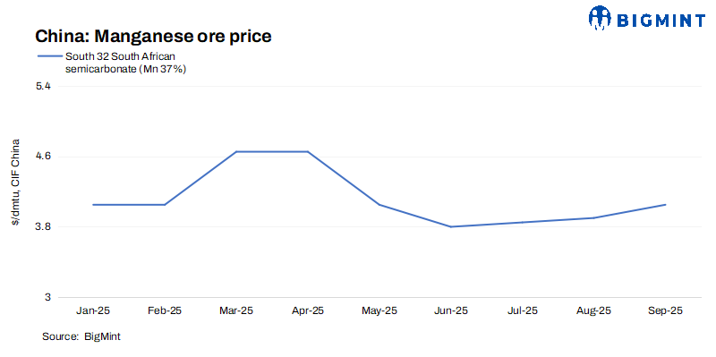 South32 raised its Sep’25 offers for South African 37% manganese ore to $4.05/dmtu (up $0.15/dmtu) and Australian 42% ore to $4.45/dmtu (up $0.10/dmtu), citing stronger Chinese silico manganese prices and renewed steel market optimism. The company also expects full production at its GEMCO mine from September, following its return to exports after cyclone-related disruptions.