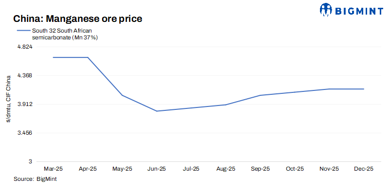 South32 has kept its Dec’25 manganese ore offers flat m-o-m, with prices of South African Mn37% material at $4.15/dmtu and of Australian Mn42% ore at $4.55/dmtu. Price were kept steady, citing balanced supply-demand dynamics, stable alloy production costs, and steady Chinese procurement sentiment.