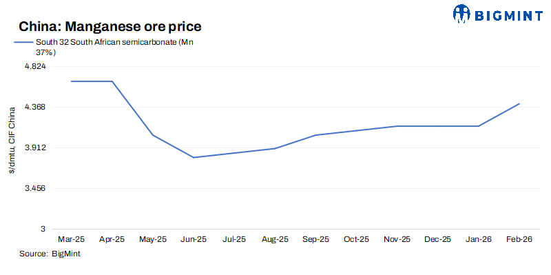 South32 increased Feb’26 manganese ore offers, with prices of South African Mn37% material at $4.4/dmtu, up by $0.25/dmtu. Prices rose because global supply has tightened and production costs have increased, pushing miners to charge more for available output.