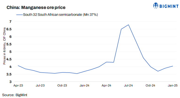 South32, a leading global miner, has raised its offer prices of 37% grade South African semi-carbonated manganese ore lumps to $4.05/dmtu CIF China for Jan’25 shipment. This marks a $0.25/dmtu increase m-o-m.
