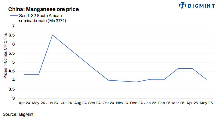 South32, a leading global miner, has reduced prices of 37% grade South African semi-carbonated manganese ore lumps for May’25 shipments. Prices inched down by $0.6/dmtu m-o-m to $4.05/dmtu CIF China.