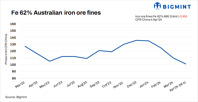 Iron ore (Fe 62%) fines spot prices fell by $0.95/t d-o-d to $98.3/t CFR China on 4 Apr’24 amid low iron ore buying interest as key participants were away from the market for the Qingming festival. The NDRC of China, the Ministry of Industry and IT, and other authorities have initiated talks and strategic planning for regulating steel production in 2024.