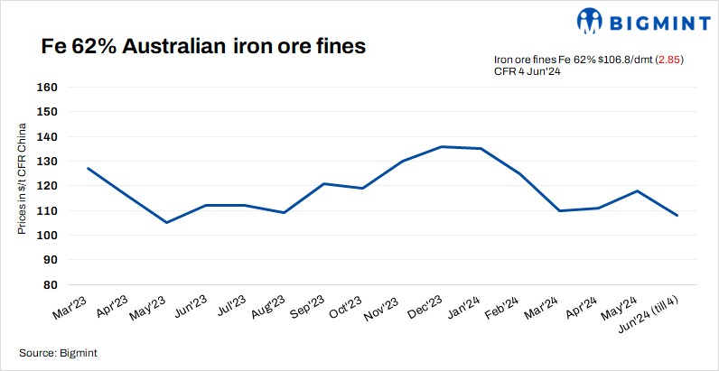 Spot prices of iron ore fines (Fe 62%) dropped by $2.85/t d-o-d to $106.8/t CFR China on *4 Jun’24 as the market continued to be under pressure due to weak fundamentals. Mills are restocking at ports as needed also inventory at the port is on a higher level. Trading activity improved as participants were interested at the decreased market prices.
