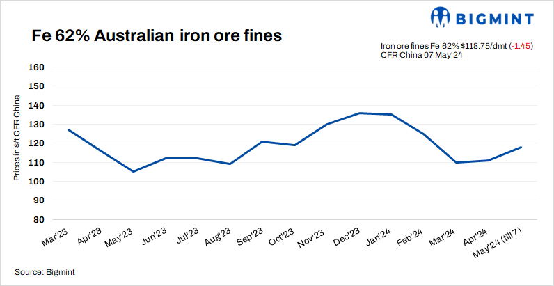 Spot prices for iron ore fines (Fe 62%) decreased by $1.45/t to $118.75/t CFR China on 7 May’24 as buyers couldn’t accept the sudden spike in the price with no significant purchasing activity. As per report, mills using April cargoes are still seeing better margins than May cargoes, considering the ongoing increase in raw material prices over the past few weeks.