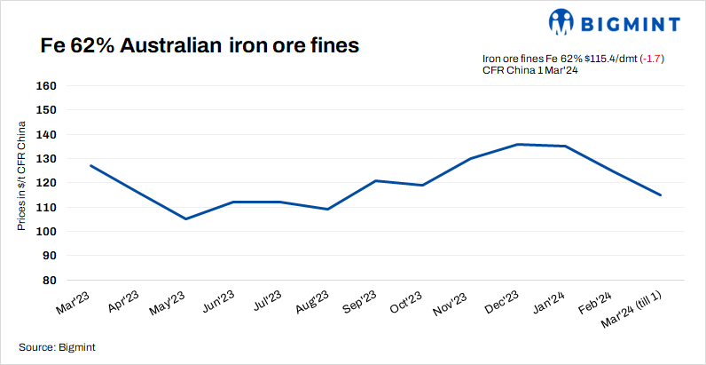 Iron ore (Fe 62%) fines spot prices dipped by $1.7/t d-o-d to $115.40/t CFR China on 1 Mar’24 due to lower trading activity. Chinese steel mills were facing challenges as they bought costly raw material stocks during February, leading to low production margins and causing hesitation to raise operating rates. Meanwhile, DCE iron ore futures fell by RMB 21/t ($3/t) to RMB 872/t ($123/t) yesterday.