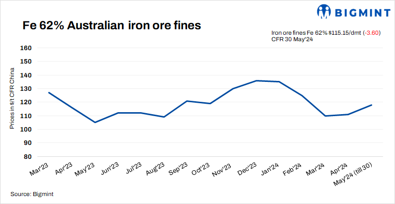 Spot prices of iron ore fines (Fe 62%) decreased sharply by $3.60/t d-o-d to $115.15/t CFR China on 30 May’24 post-discussions for crude steel production cut amid a declining Chinese property market. As per the report, news related to steel production controls may have adverse effects on iron ore prices and the upcoming June delivery cargo.